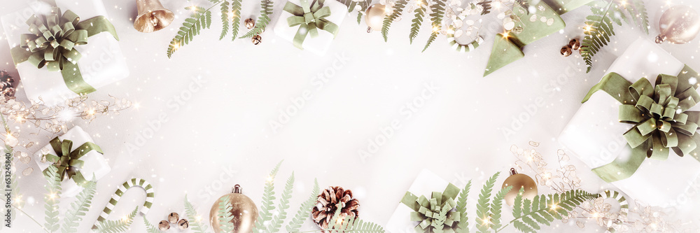 White Christmas banner with copy space. Christmas decoration with presents on white background. 3D Rendering, 3D Illustration