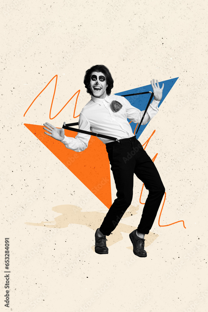 Vertical collage picture of excited cheerful black white colors guy hands pull suspenders dancing mexican dead day celebration