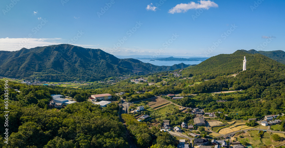 Small village in green landscape with Buddha statue on Shodo Island
