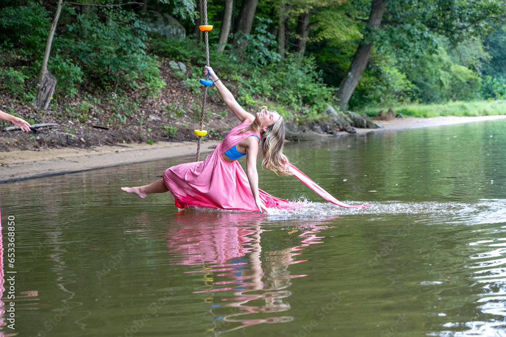 Having fun on a swing on the lake, ladies in pink