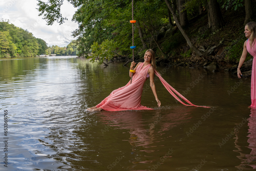 Having fun on a swing on the lake, ladies in pink
