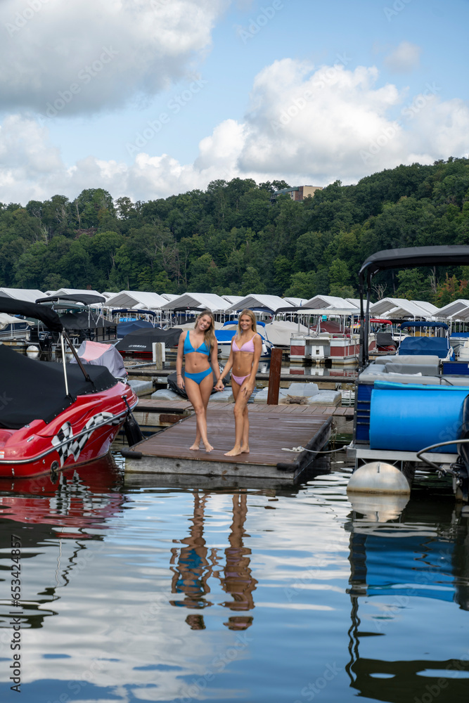 Two pretty young girls at a boat marina
