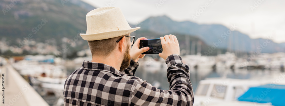 Traveller millennial man taking pictures of luxury yachts marine during sunny day - travel and summer banner with copy space