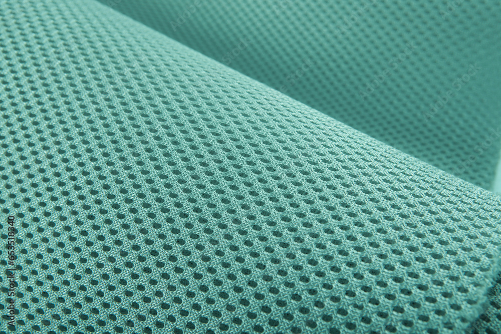 Rough pool green fabric texture, cotton knitted fabric, modern waterproof flexible temperature control materials, multifunctional smart textile close-up, selective focus, does not tear