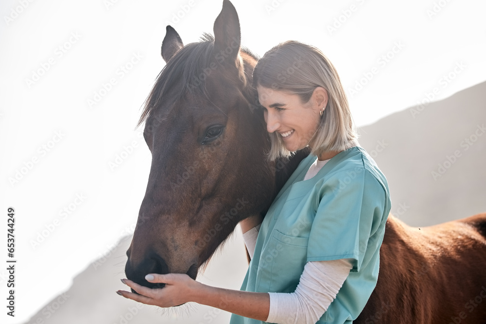 Horse doctor, care and smile outdoor at farm for health, care or happy with love for animal in nature. Vet, woman and equestrian healthcare expert in sunshine, countryside and helping for wellness
