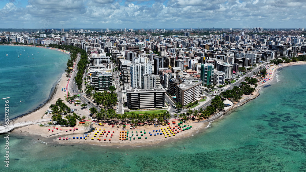 Maceio Alagoas Brazil at brazilian Northeast. Aerial panning shoot of turquoise water beach at Maceio Alagoas Brazil. Landmark beach tourism sights. Travel destination
