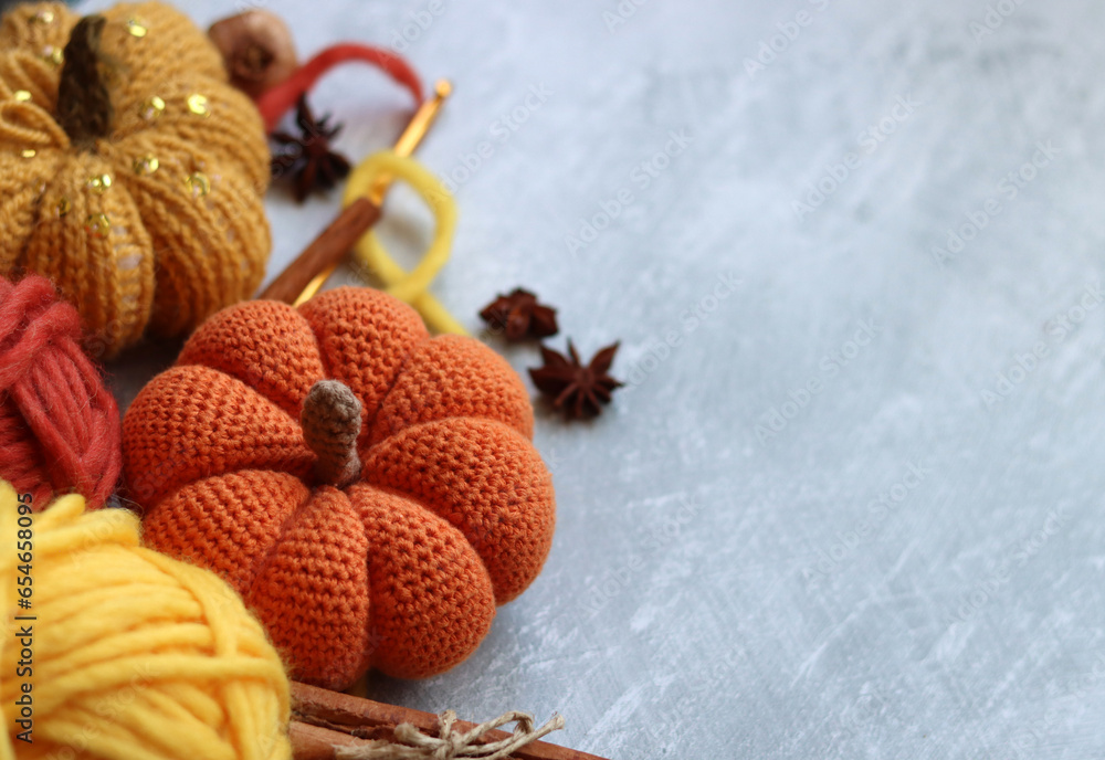 Cozy autumn crochet. Close up photo of handmade amigurumi toys on textured background with copy space. Hobbies and leisure concept.