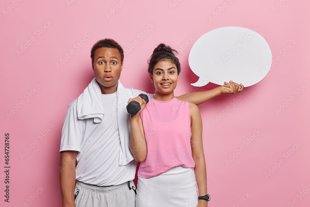 Photo of sportswoman and her trainer stand closely to each other do physical exercises with dumbbell demonstrate blank speech bubble for your advertising content isolated over pink background