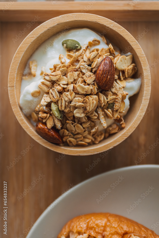 Close up of homemade breakfast. cereal granola in wooden bowl.