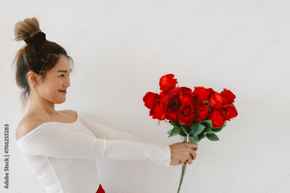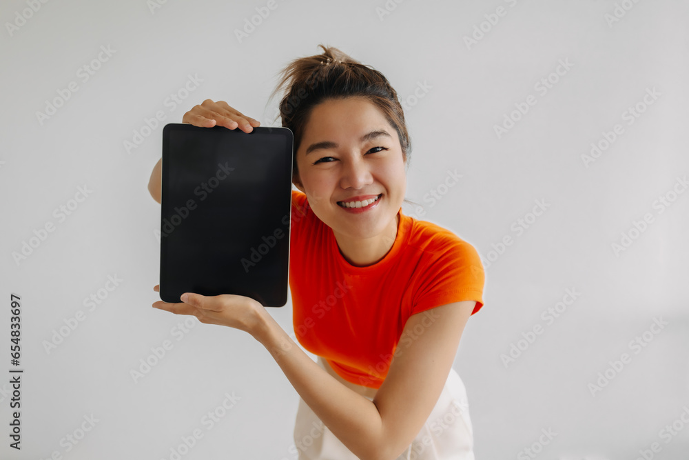 Thai asian woman bun hair wear orange cropped t-shirt, holding and showing tablet computer black screen, isolated on white background. Smiling and looking at camera.