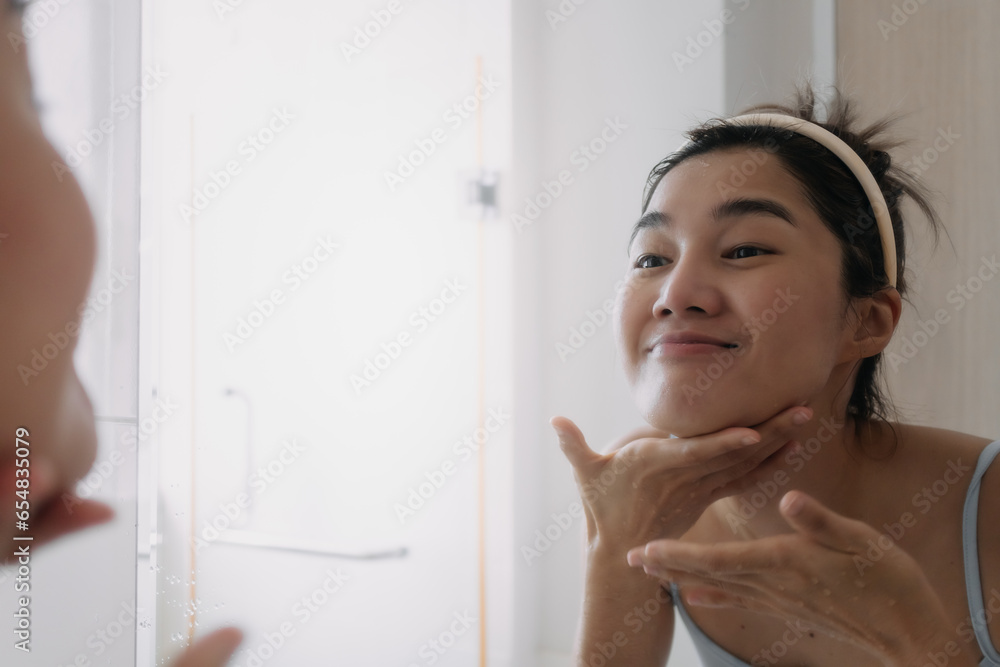 Asian Thai woman washing cleaning and massage her face, using cleansing foam, look at the mirror, water spread in the bathroom.