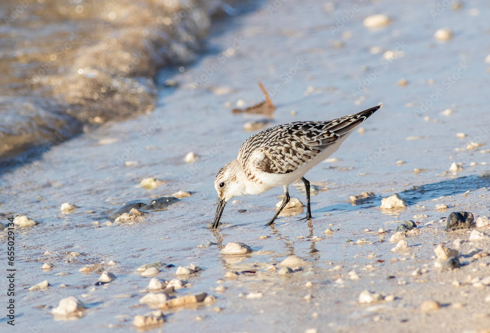 A sanderling sandpiper feeding in the sand at the edge of the shoreline