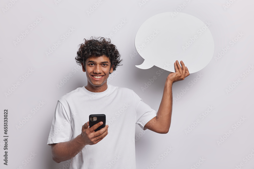 Waist up shot of cheerful handsome Hindu man with glad expression dressed in casual tshirt uses mobile phone for chatting online holds blank speech bubble for your text isolated on white wall