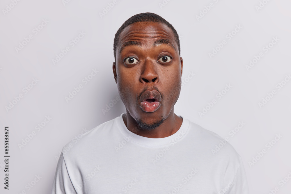 Portrait of shocked dark skinned young man with beard reacts to stunning news stares in great disbelief has widely opened mouth and bugged eyes wears casual t shirt isolated over white background.