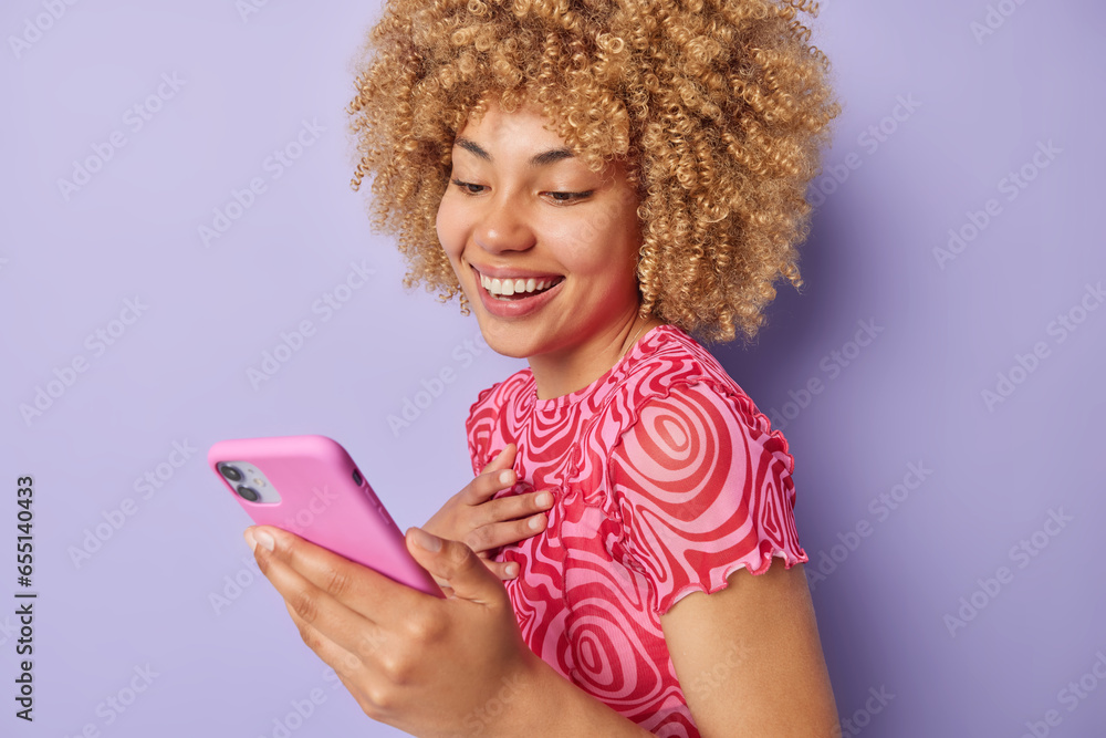 People and happiness. Studio sideway photo of young beautiful cheerful smiling African maerican female standing in centre isolated on purple background holding smartphone reading funny message