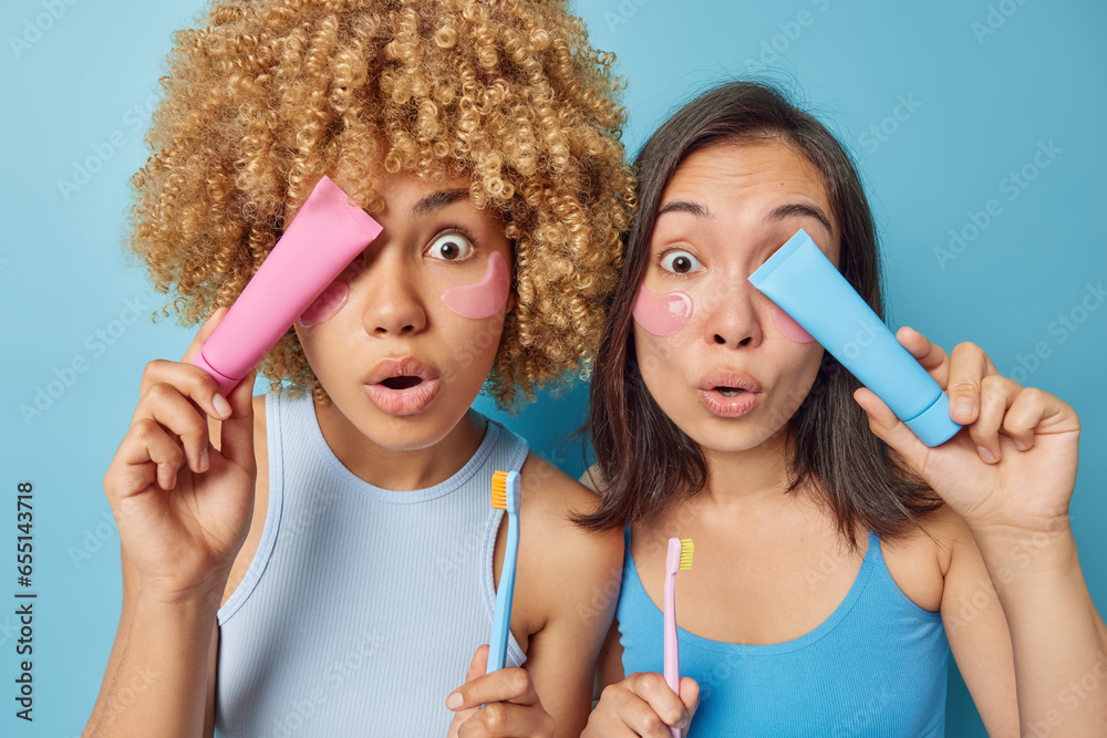 Teeth whitening and dental care concept. Shocked surprised women hold toothpaste and toothbrush apply hydrogel patches under eyes to reduce wrinkles stand closely to each other isolated over blue wall
