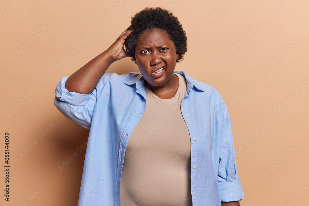 Photo of displeased confused overweight African woman keeps hand on head purses lips wears casual blue shirt doesnt know how to solve problem isolated over brown background. Negative emotions