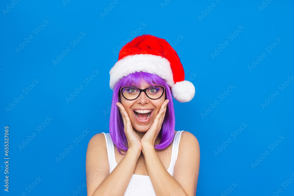 A young caucasian amazed smiling blonde woman with violet hair and red Santa Claus hat holding her hands to her face isolated on a color blue background. Christmas and New Year concept