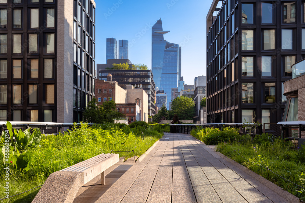 The High Line promenade with Hudson Yards skyscrapers. Elevated greenway park in Chelsea, Manhattan, New York City