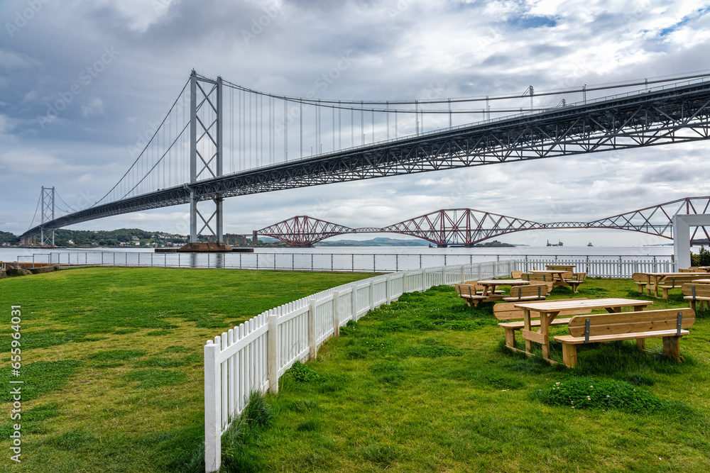 View from the shore of the hanging port that crosses the Firth of Forth in Edinburgh, Scotland.