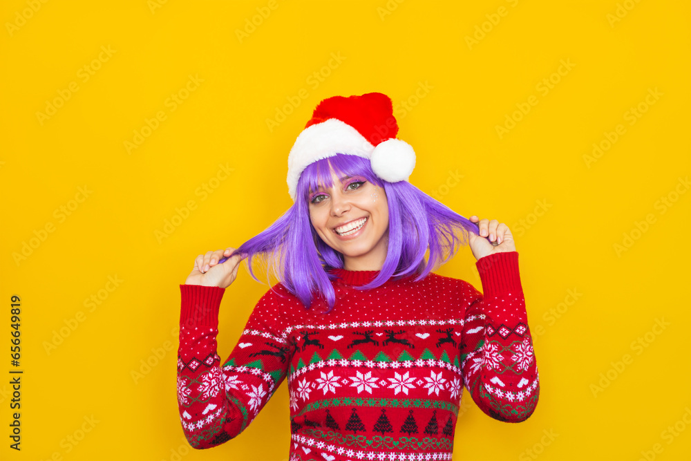 A young happy joyful smiling woman with violet hair in a red deer sweater and Santa hat holding strands of hair in her hands isolated on a solid color yellow background. Christmas and New Year concept