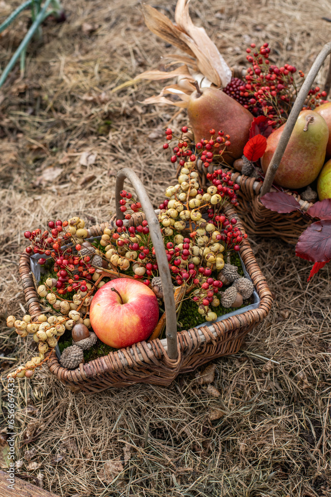 Korb aus Metall gefüllt mit Nüssen und Birnen, Herbst Dekoration