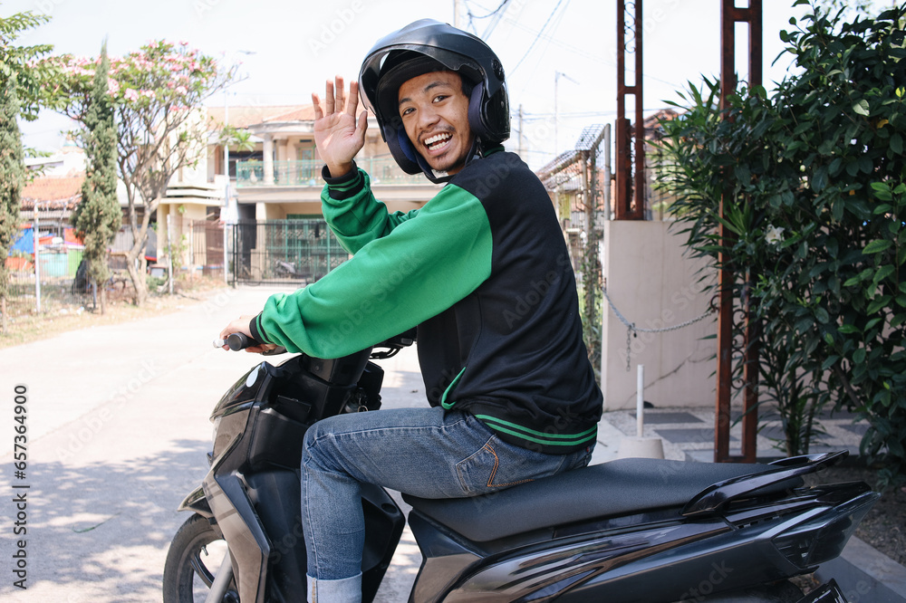 Back view of happy commercial motorcycle taxi driver wearing helmet and uniform jacket waving hand say hi or goodbye
