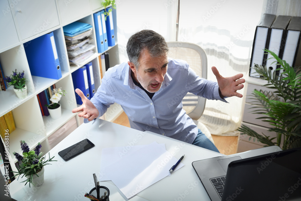 Angry man in front of a laptop in office