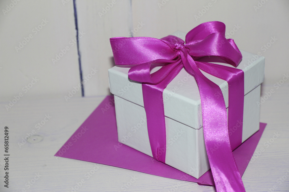 Geburtstagsgeschenk mit pinkem Schleifenband auf weißem Hintergrund
