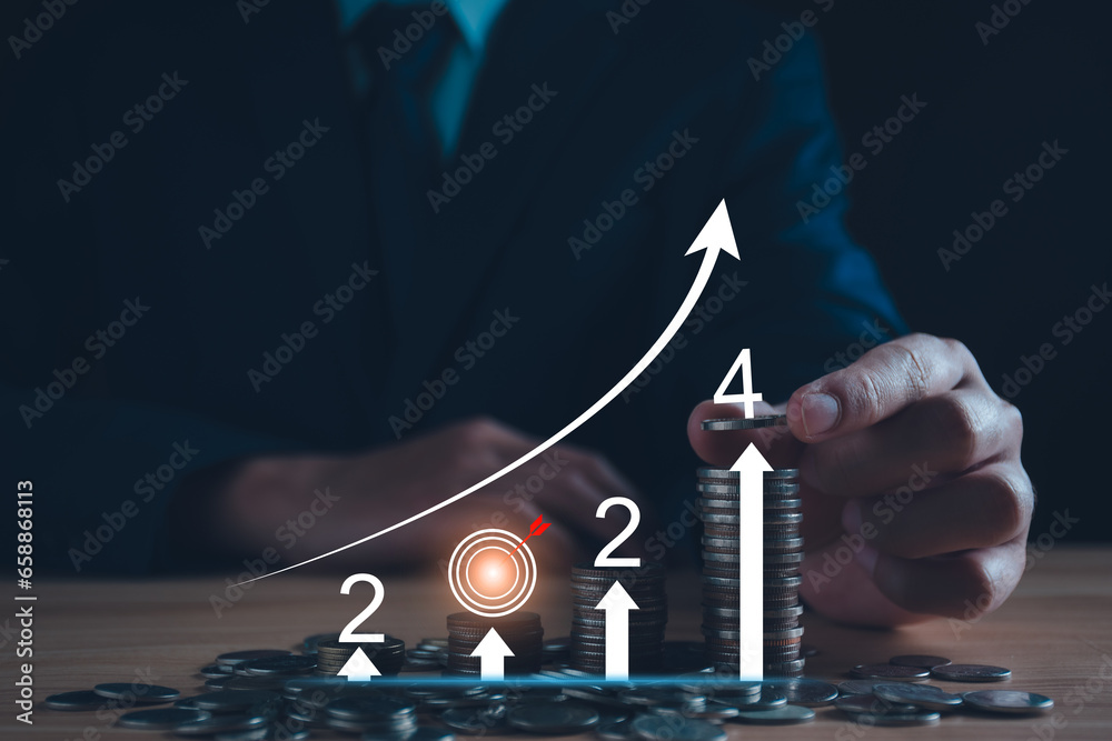 Interest rate and dividend concept. Businessman with percentage symbol and up arrow, 2024, Interest rates continue to increase, return on stocks and mutual funds, long term investment for retirement.