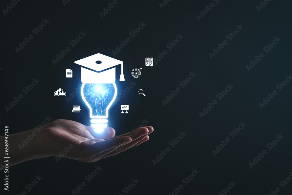 E-learning graduate certificate program concept. man holding lightbulb showing graduation hat, Internet education course degree, study knowledge to creative thinking idea and problem solving solution