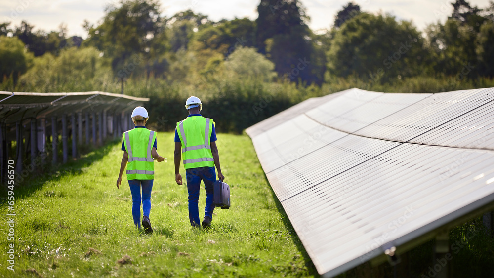 Rear View Of Male And Female Engineers Inspecting Solar Panels In Field Generating Renewable Energy