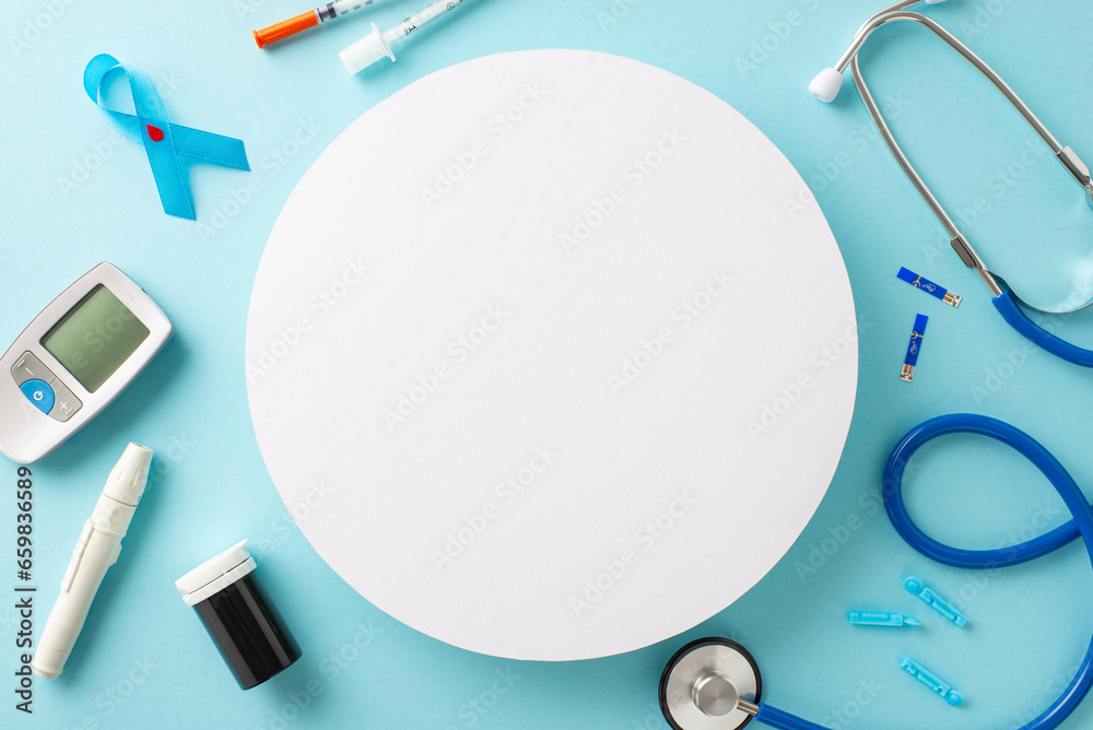 Diabetes Awareness Month support. Top-view shot of diabetes emblem - blue ribbon, glucometer kit, insulin syringes, stethoscope, on a pastel blue backdrop, with empty circle for your text or advert