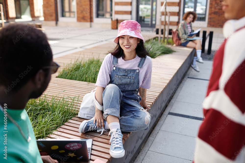 Portrait of carefree young Asian girl talking to group of friends on campus outdoors and wearing fun denim outfit, copy space