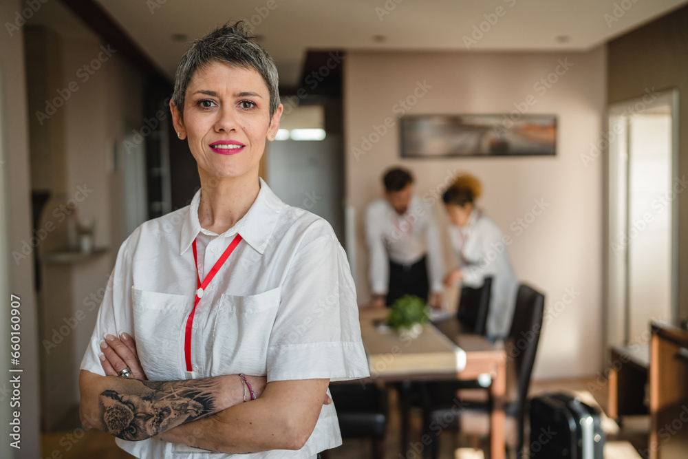 woman businesswoman senior caucasian female manager or entrepreneur prepare for conference or meeting in hotel room while taking a brake standing confident official real people copy space