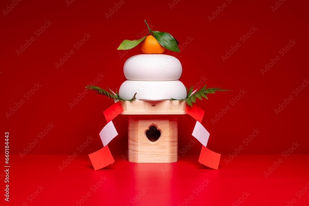 “鏡餅"を中央に配置した写真 赤背景 三宝(台座)あり
