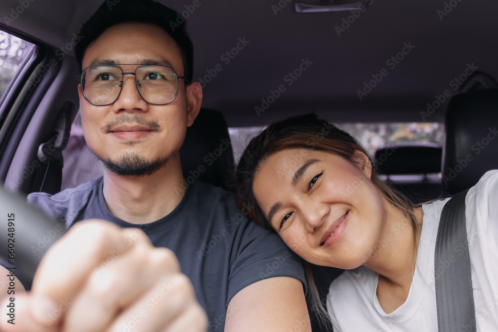 Asian Thai couple smiling happy time while driving a car on road, enjoy vacation holiday. front view.