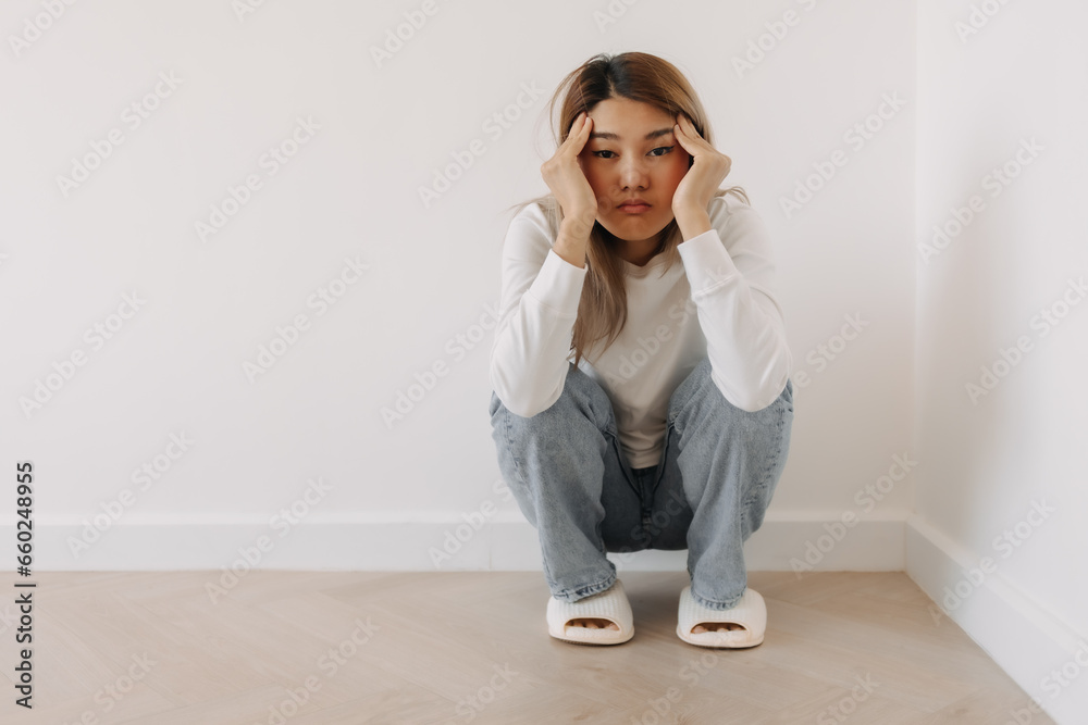 Asian Thai woman sitting on the heels, squatting, got headache with migraine, thinking too much, have no idea, tired in white apartment room in winter.