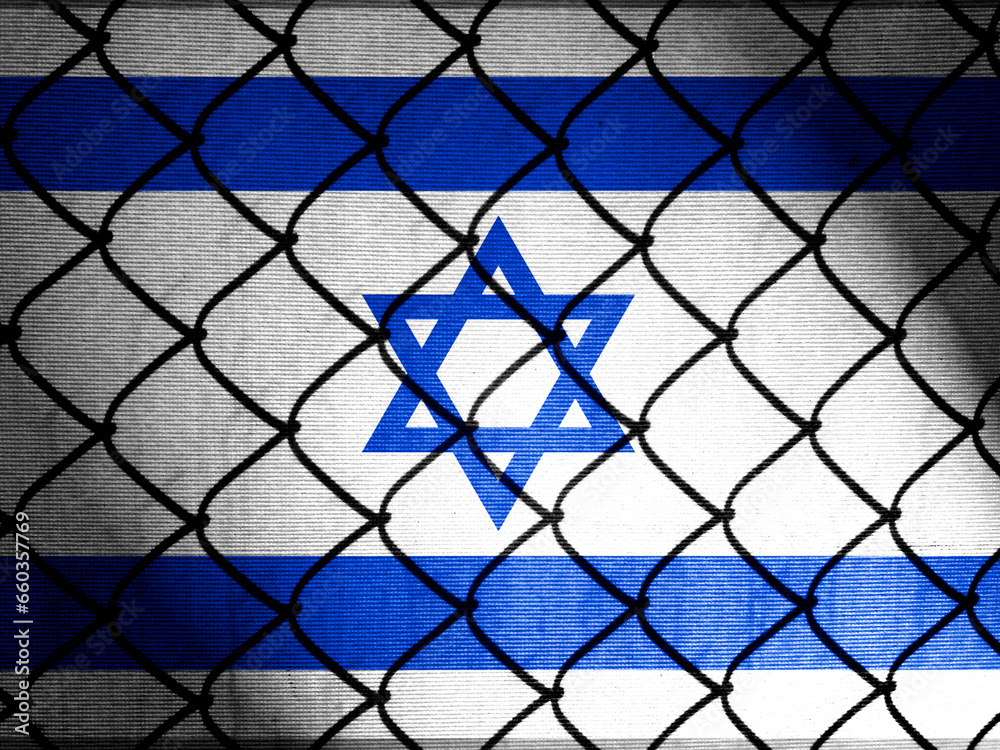 Combination of Israeli flag and barbed wire. Describing Israel as being at war. Israeli-Palestinian War. Basemap and background concept. Double exposure hologram.