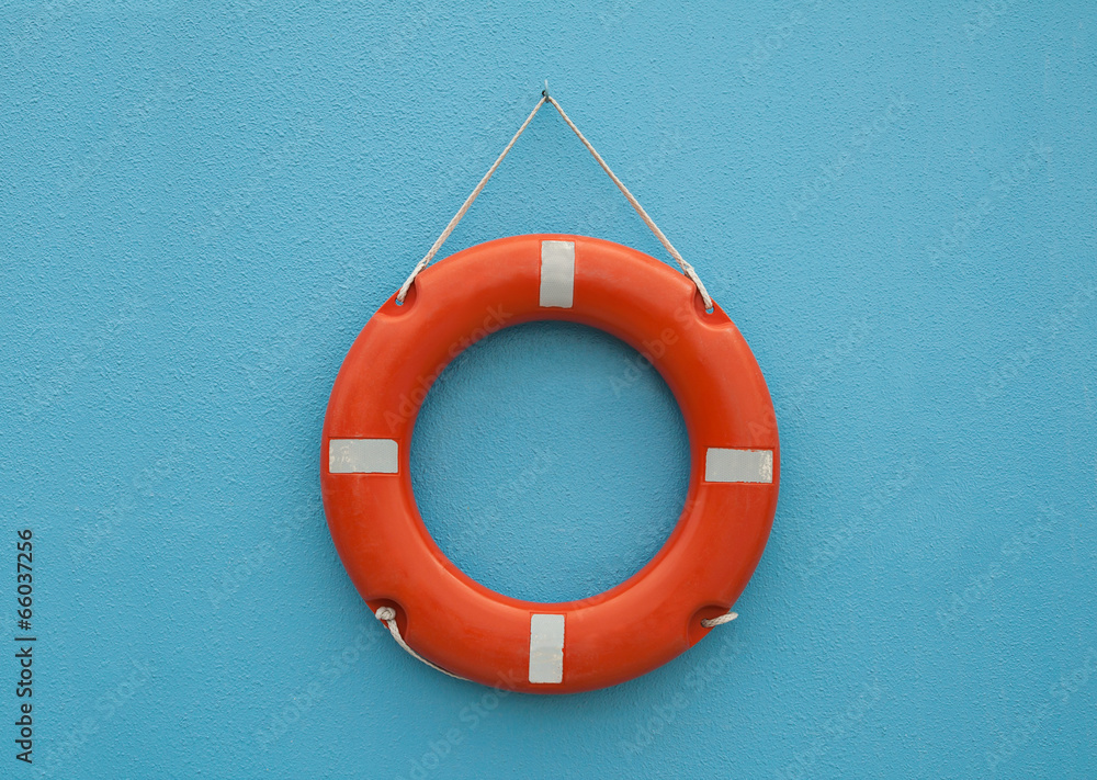 Red life buoy hanging on blue wall. Help and support concept.