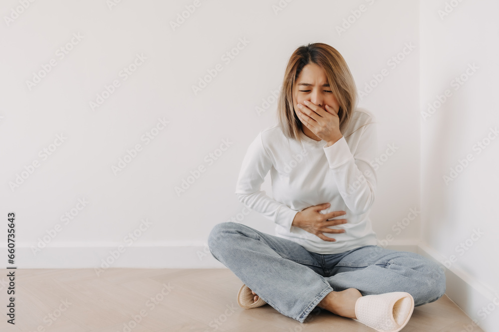 Asian Thai woman feeling sick and queasy, has a stomachache cramp, grabbing stomach with one hand and covering mouth in white sweater, sitting on floor in white apartment room in winter alone.