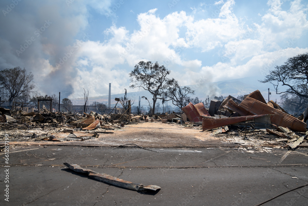 Burnt out remains of Lahaina, Maui, Hawaii the morning after the devastating fires. Image taken on August 9, 2023.