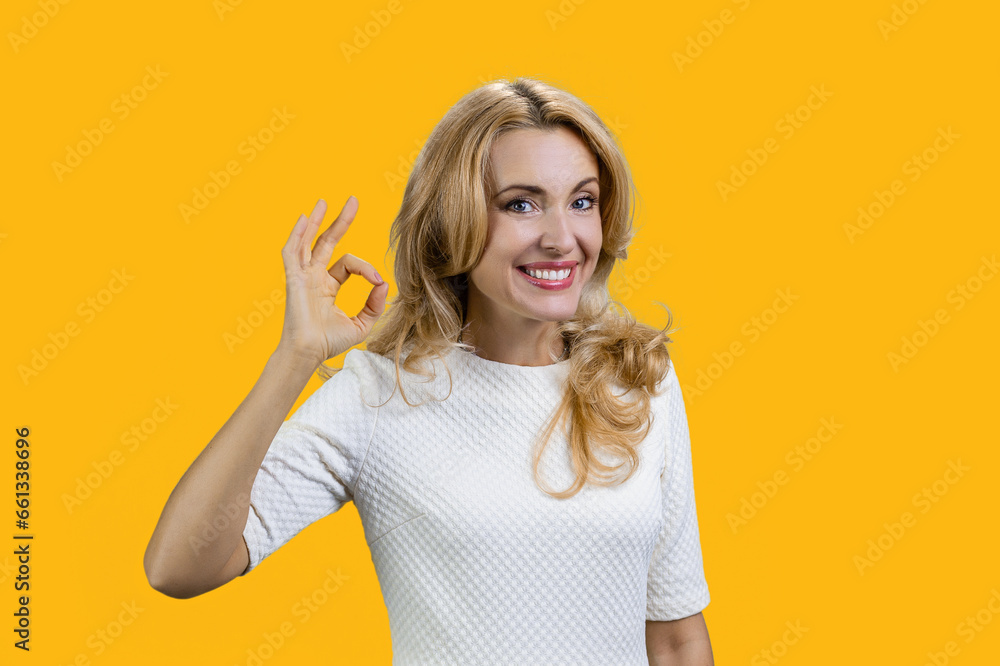 Portrait of a happy mature blond woman shows ok gesture sign. Isolated on orange.