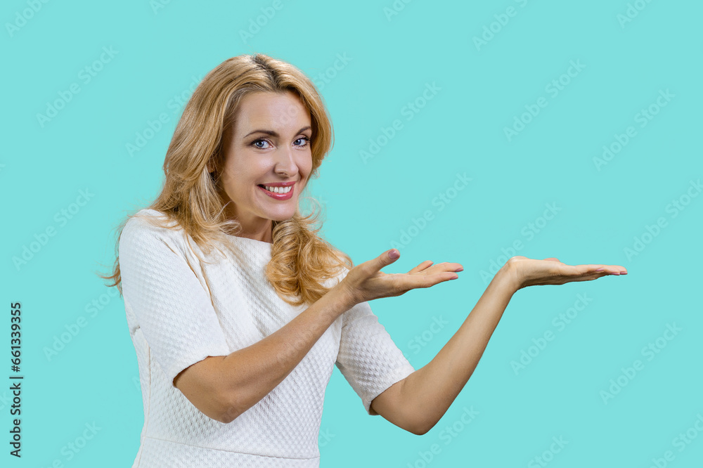 Portrait of a mature caucasian woman presenting copy space with both hands. Isolated on turquoise.