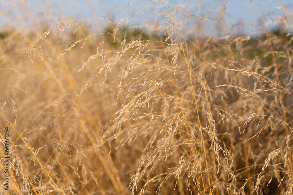 Dry stems of wild grass Deschampsia cespitosa in the garden.