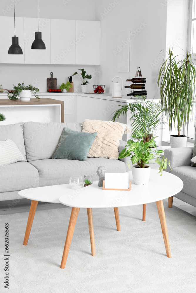 Interior of light open space kitchen with cozy grey sofas and coffee table