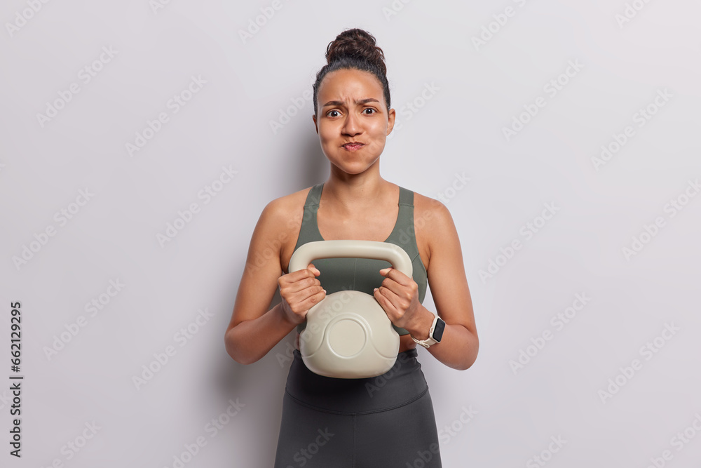 Horizontal shot of young determined Latin woman doing weight lifting workout puts all efforts of lifting hard weight dressed in sportswear isolated over white background has training in gym.
