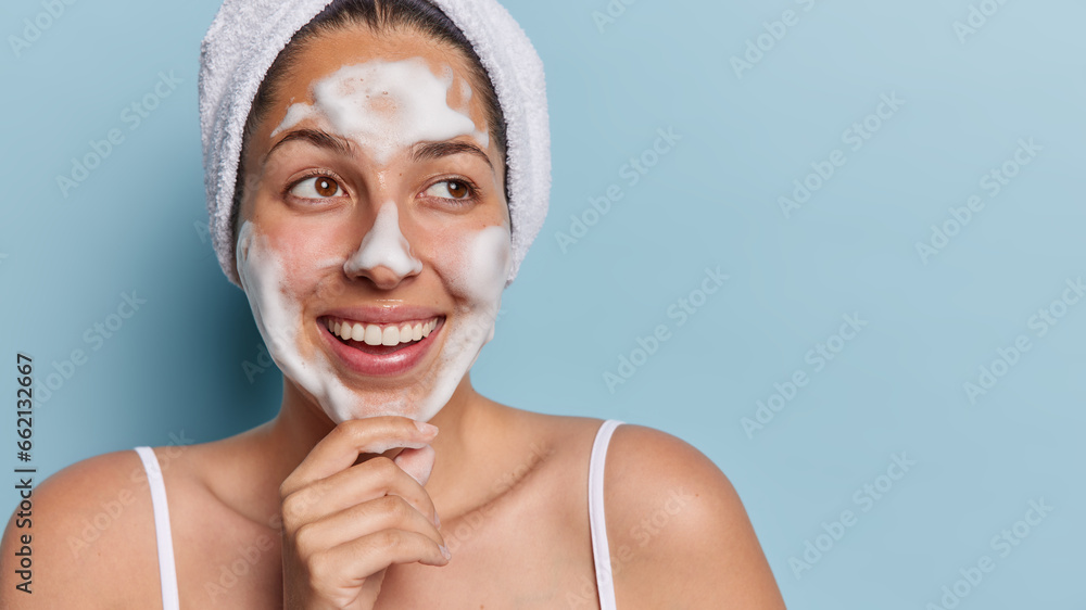 Hygiene and cleanliness concept. Positive young woman keeps hand on chin applies foam on face poses with bath towel wrapped on head isolated over blue background copy space for your promotion