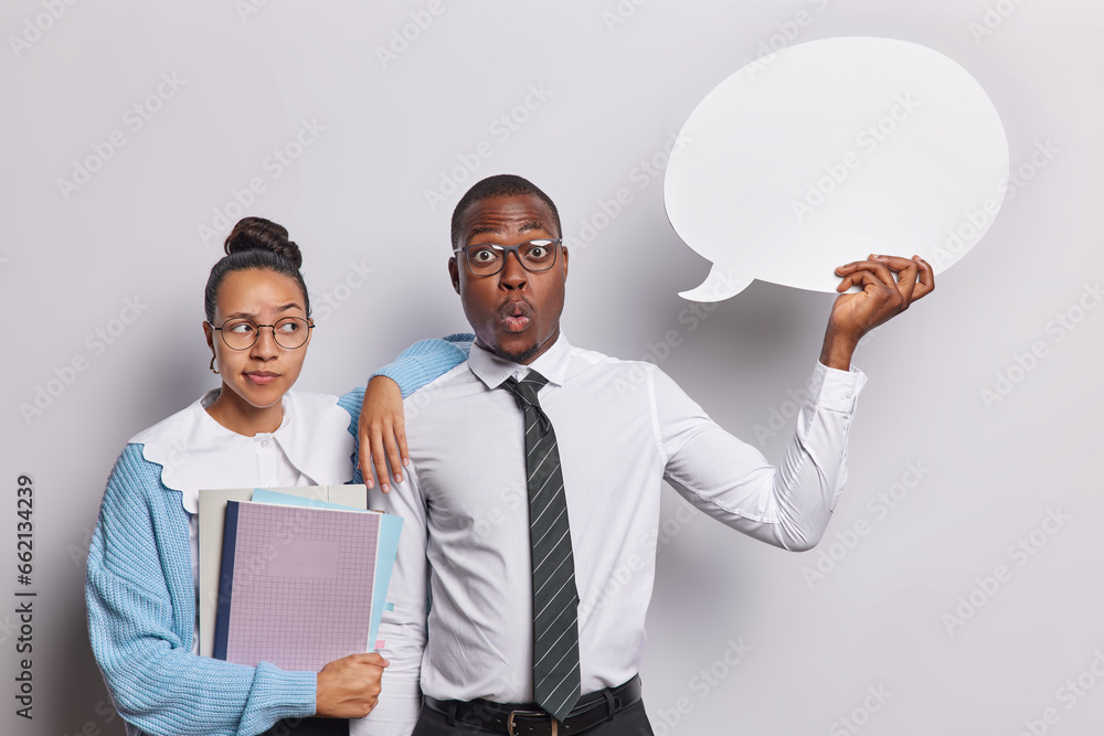 Indoor waist up of young surprised African american man and dissatisfied woman standing on left isolated on white background holding notebooks and speech bubble with blank space for your promotion
