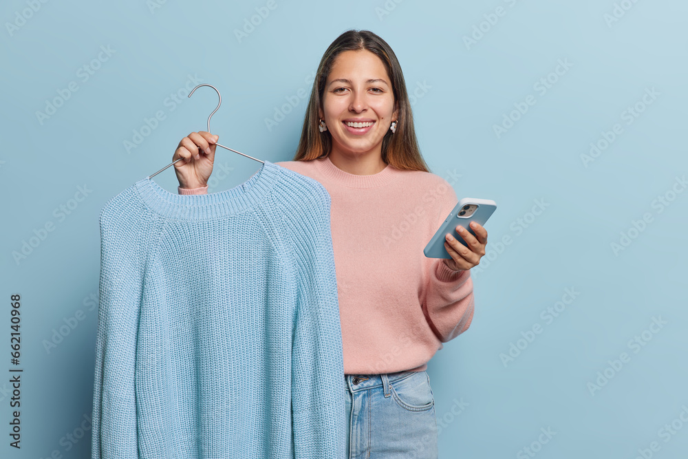Indoor shot of cheerful woman with straight long hair holds jumper on hanger and smartphone in hand sells old clothes or gives as donation isolated over blue background. People and shopping concept